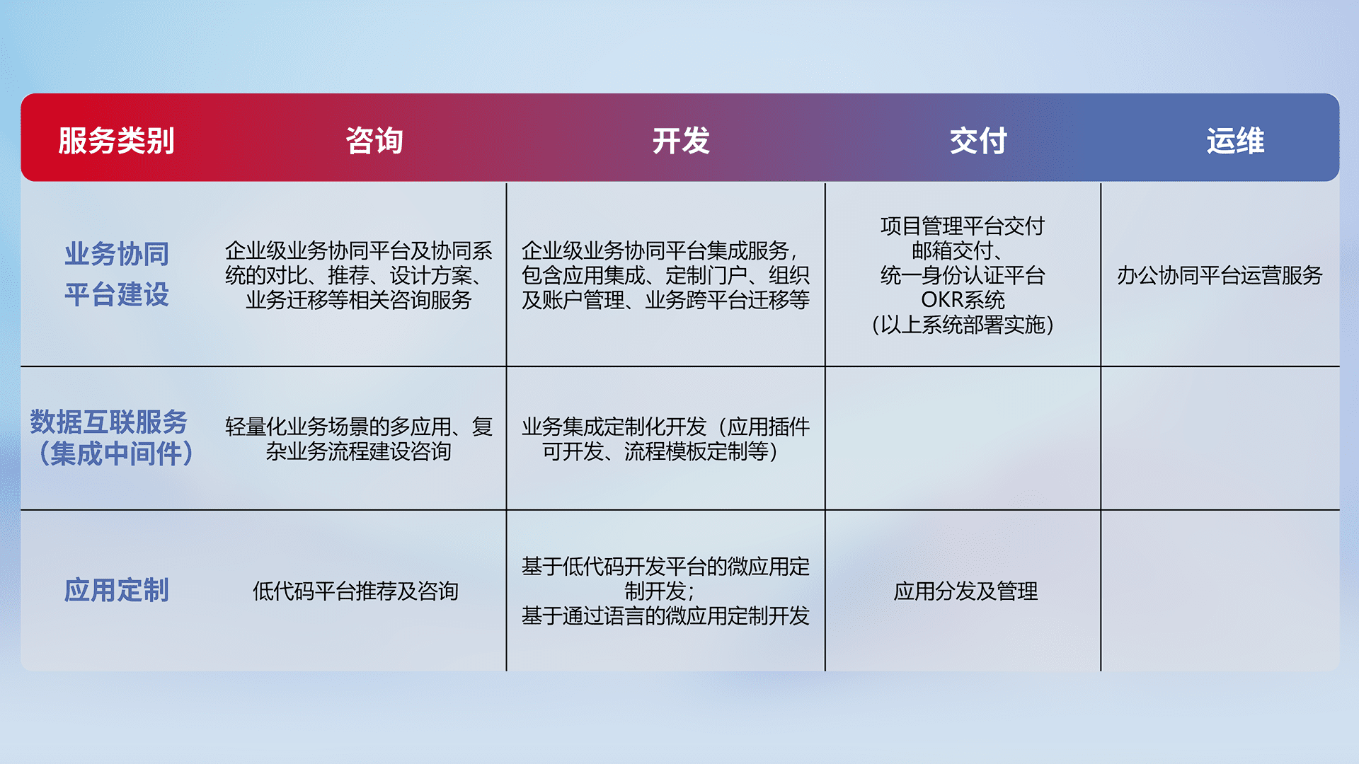 针对钉钉、、、、企微、、、、IDaas等平台级产品提供产品的规划、、方案、、交付、、定制化开发等服务,,,,实现如统一协同办公、、智能客户服务、、、混合会议管理、、智能数据查询、、等业务场景,,实现数字化转型。。。。